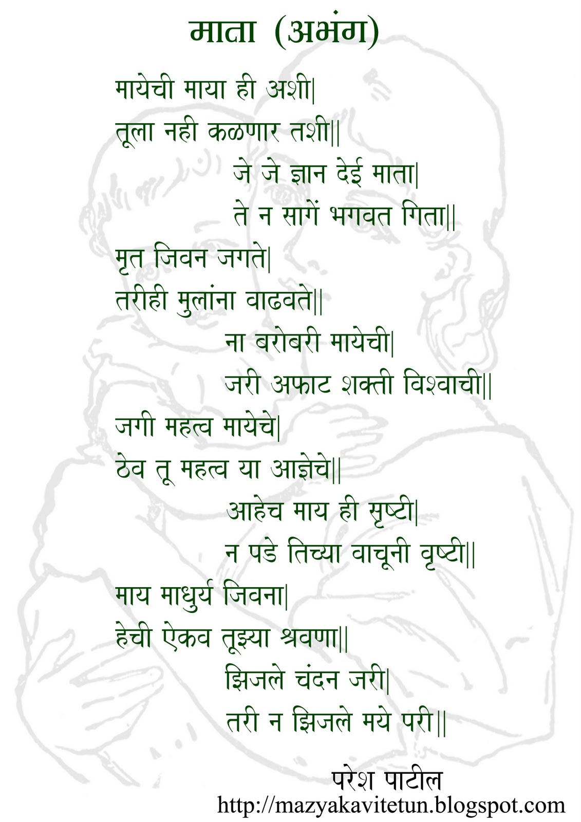 Devotional Poems, Life Poems, Love Poemsमाता – अभंग (Mother) January 5, 2012August 10, 2024 Paresh Patil aaiaai tuza aashirvadaaicha kalijaaichi mayaaayushyavar bolu kahimamatamammimarathi kavitamarathi poemmatamayechi mayamaze babamazi aaimotherpriya aaisshamchi aai